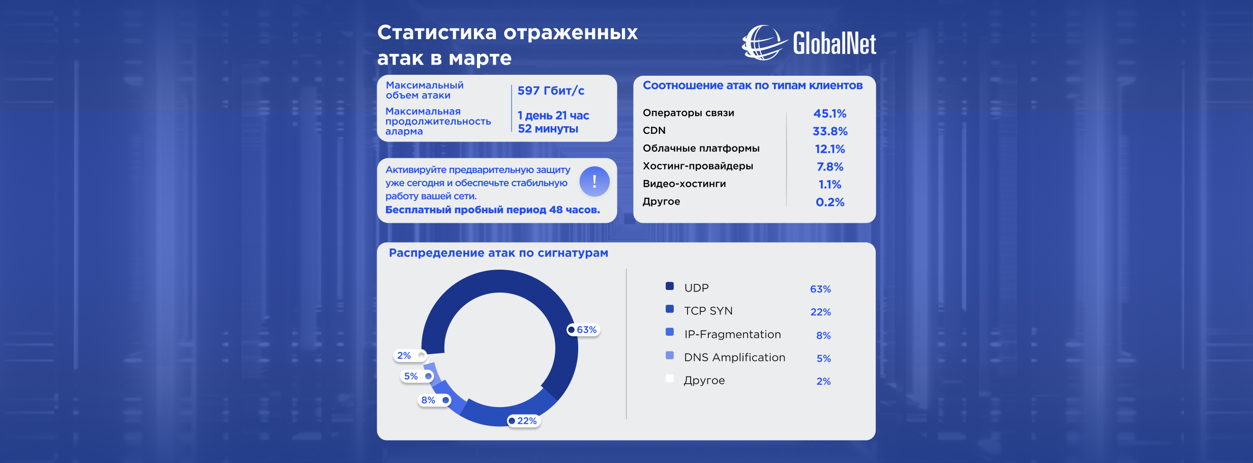 Публикуем данные по отражённым атакам за март. В этом месяце отработали экстренное подключение защиты в момент активной атаки.